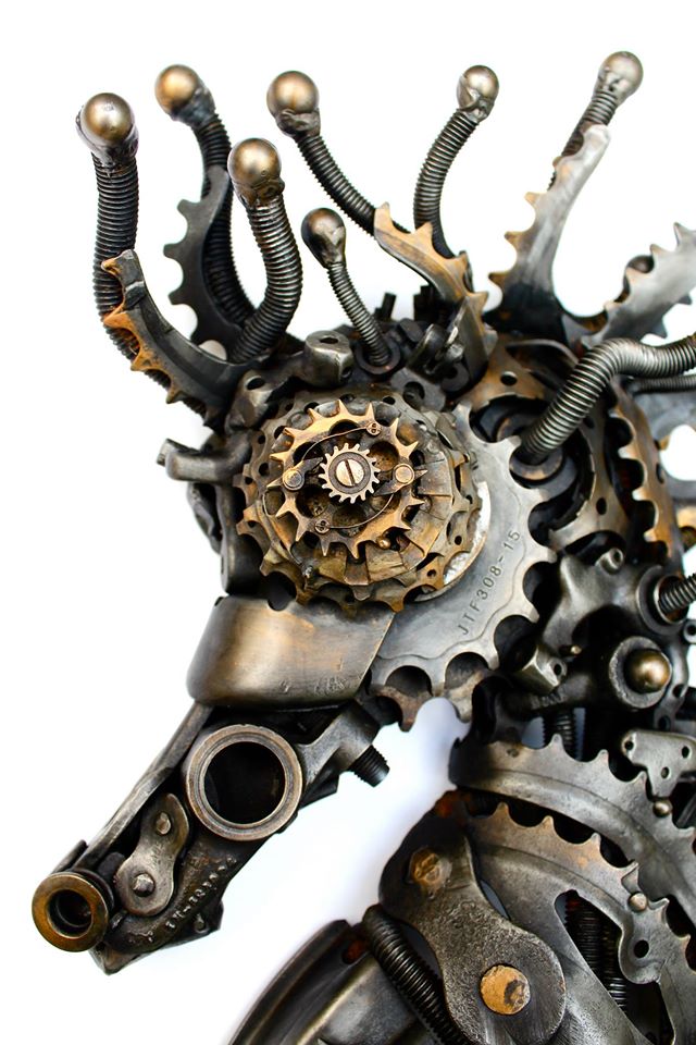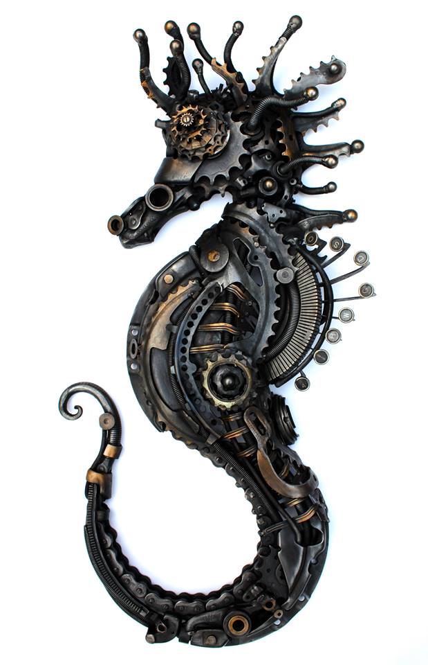 Der britische Metallkünstler Allan Williams aus Sussex stellte dieses handgemachte Seepferdchen im Steampunkstil aus diversen Zahnrädern, einigen Kleinmotorteilen und einer alten Schreibmaschine her; grandios, ich danke ihm dafür.