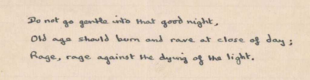 #Dylan Thomas‚ 70jährige Villanelle, die er schlicht nach der Gedichtform so benannte, trug ursprünglich nie einen Titel; erst viel später wurde sie von der Leserschaft benannt & bekannt nach der ersten Verszeile „Do not go gentle into that good night“. Ihr zugrunde liegt dieser persönliche Pastiche@Wortlieb – Eine Hommage auch zum heutigen 107. Geburtstag des walisischen Dichters: